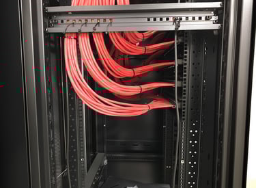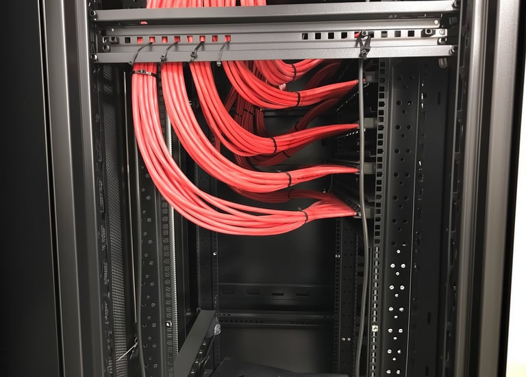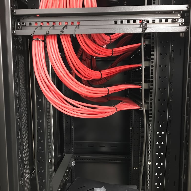 Technology: Professional cable routing and organization in server room environments Coverage: Systematic cable management ensuring clean, maintainable infrastructure with proper documentation and labeling for long-term operational efficiency.