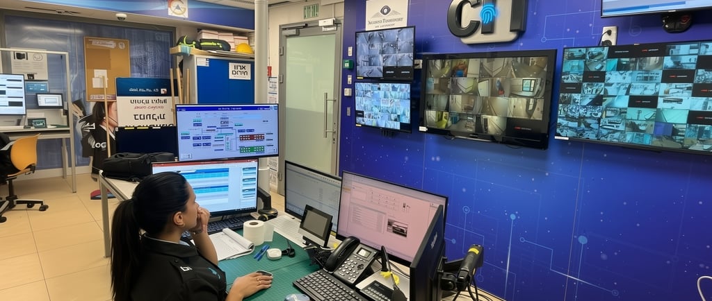 It's 3:47 PM on a Friday afternoon at Azrieli Acre Mall, and the command center is alive with activity. Six large monitors display live feeds from over 200 security cameras spanning multiple retail levels, parking areas, and service corridors. A security operator scans the screens methodically, her trained eye moving between mall entrances crowded with weekend shoppers and quieter back corridors where delivery personnel navigate service routes.